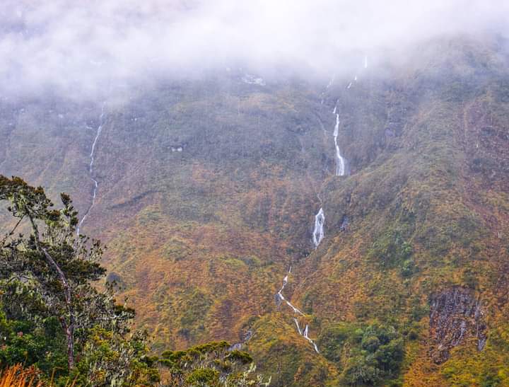 Scarlet Rhododendron and Dimorphanthera abound in the gnarled dwarf forest and white beard lichens hang in the branches. Above 3,400 m (11,200 ft) on the vast alpine plateau, creeping Astelia, cushion plants and mosses can be found near the numerous tarns, along with alpine blueberries (Vaccinium) and asters in rockier areas.